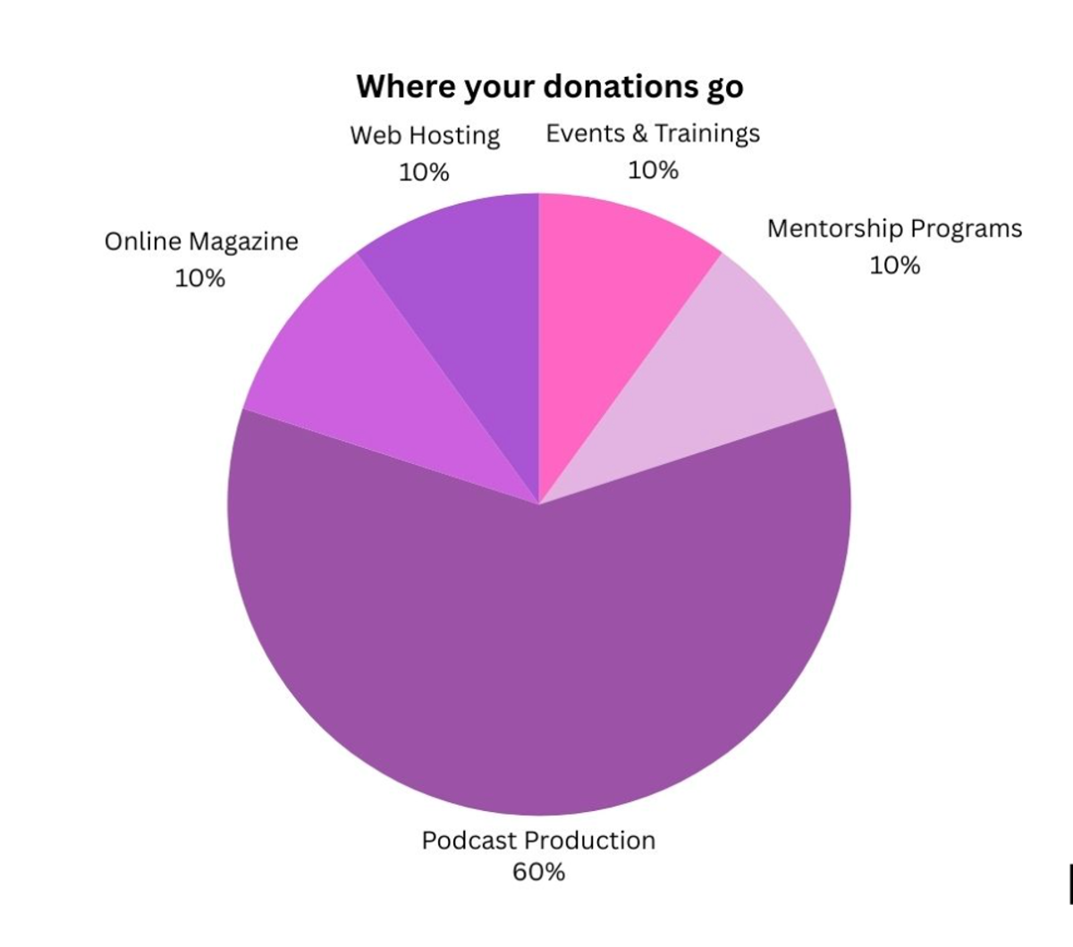 We could not do this without your monthly donations. To provide continued transparency, we’ve updated our statistics on where your donations have made the most impact (TL;DR 60% to podcast production; and 10% apiece to the Online Magazine, Web Hosting, Events & Trainings, and Mentorship Programs) – with 0% overhead as we are currently completely volunteer-driven.