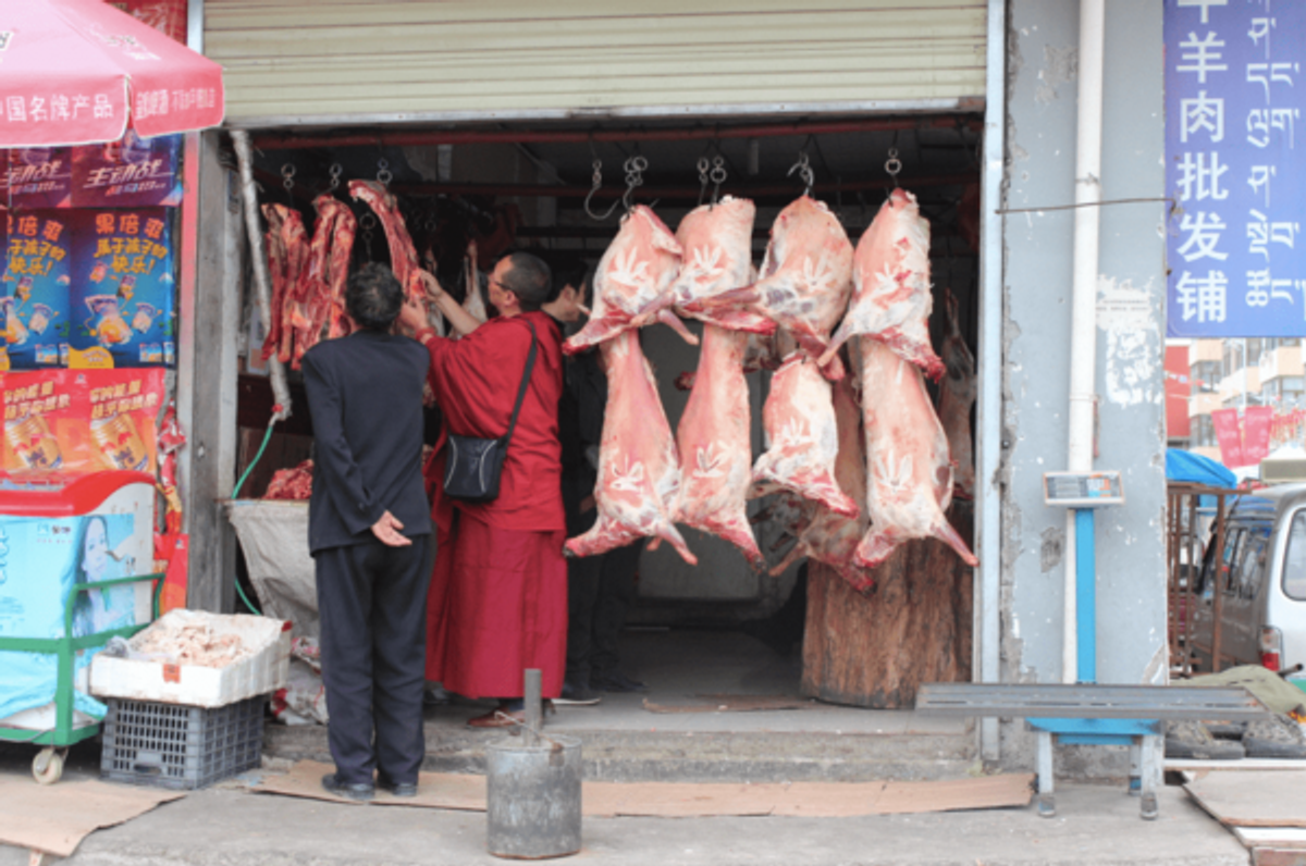 A disruption in expectations: A monk pictured buying meat