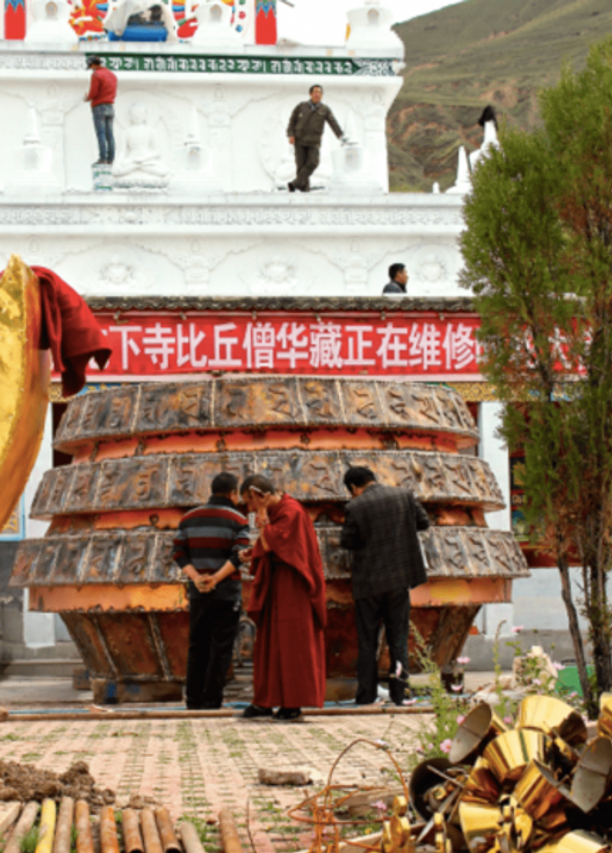 New Age or new age? A monk holds a cellphone in front of a renovated Stupa at the Rongwo Monastery