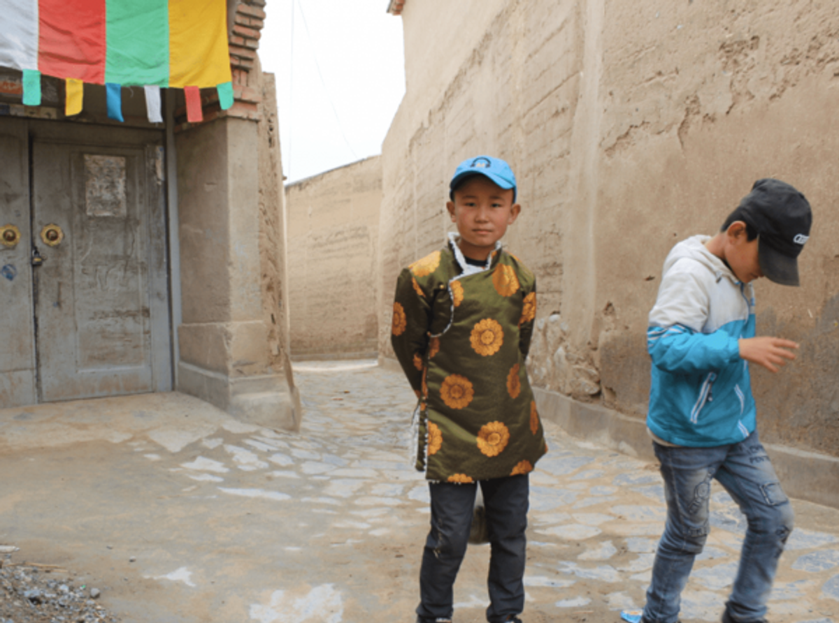 Dual vision: Tibetan twins in a Tu Village illustrating modernity and traditional clothing
