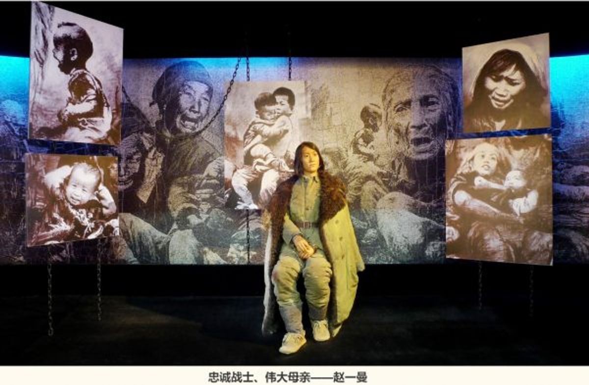 This, then, showed the “great mother” component of Zhao Yiman’s story. Zhao was not only portrayed as a “faithful soldier,” like her male comrades, but also as a devoted mother. To the left of the bust was a blown-up photo of Zhao holding her small son, Ning’er, on her lap. The exhibit made it clear that her final thoughts before her execution were of her son. However, this maternal love did not exist in isolation, but was inextricably linked to Zhao’s sacrificial devotion to her country. The purposeful juxtaposition of black and white in the exhibit, used to evoke the landscape of the Northeast, further links Zhao’s affection for her son to that of the land itself and the patriotic rallying cry “huan wo he shan” (return our rivers and mountains).